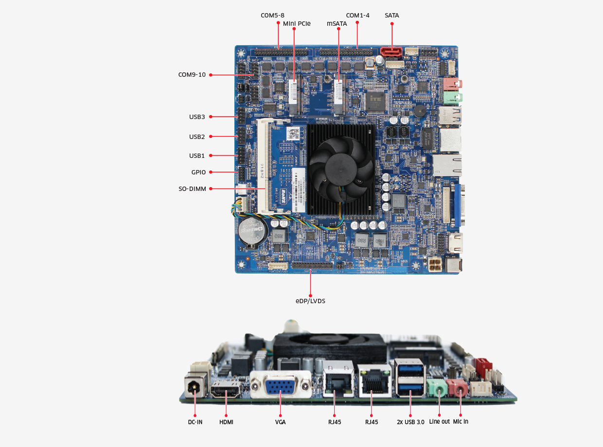 SATA3.0, mSATA, mini-PCIe, 10xCOM
