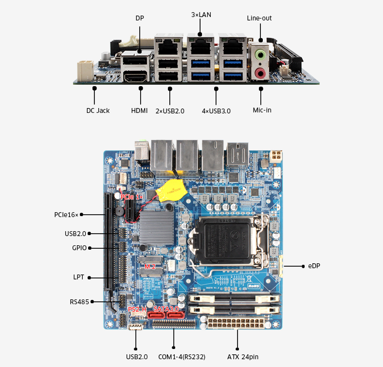 The MITX-SKD70 is an embedded motherboard, supporting Intel® latest 6th and 7th Gen. Core™ i3/i5/i7 Celeron/Pentium processor. Loaded with B150/H110 chipset, this board features 1×Display Port and 1× HDMI, and also has 3×10M/100M/1000M LAN (Intel i211). It carries 2×DDR4 DIMM 2133/1866MHz slots up to 32GB to add higher bandwidth and lower latencies for processes.