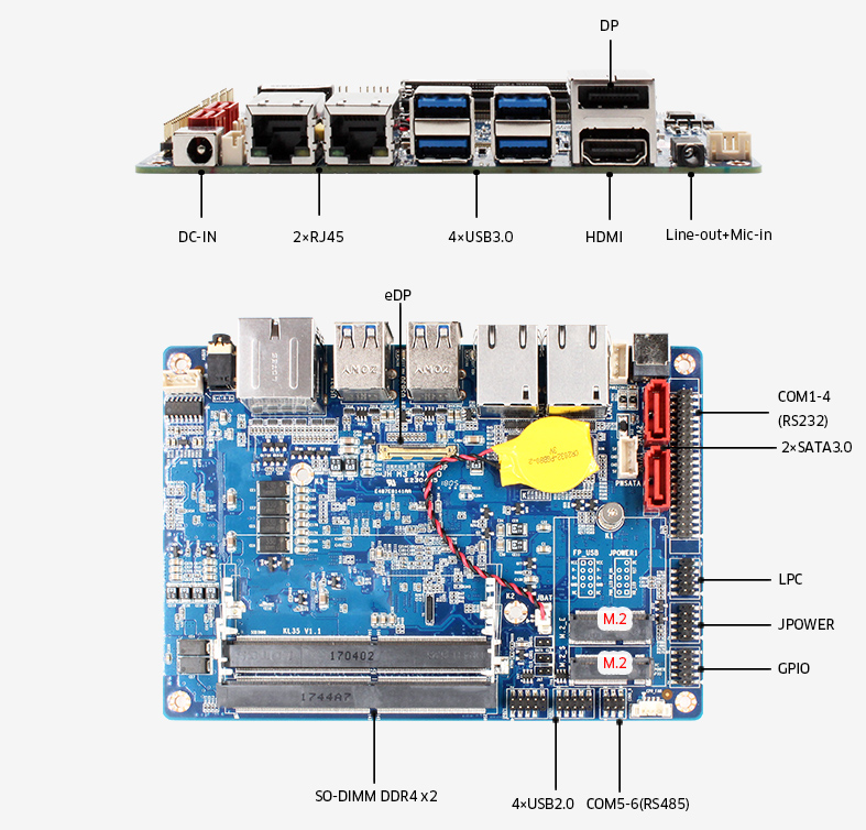 This board features multiple display via 1×Display Port1.2 and 1×HDMI1.4 and 1×eDP. It carries 2×DDR4 SO DIMM 2133MHz slots up to 32GB to add higher bandwidth and lower latencies for processes. It has 2×10M/100M/1000M BASE-T gigabit LAN (Intel i211/i219), 4×USB3.0, 4×USB2.0, 4×RS232, 2×RS485, 1×LPC(optional), 8×GPIO.